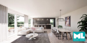 – au rez-de-chaussée : hall d’entrée, cuisine ouverte sur une grande salle à manger/séjour avec accès à la terrasse et au jardin, réserve, WC séparés, garage pour 2 voitures